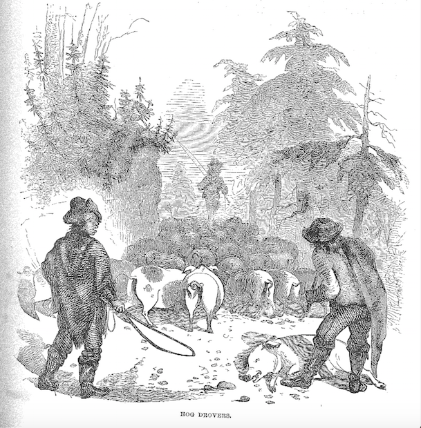 The atlasobscura article mentioned, “In 2006 a prominent archaeologist, a specialist in livestock, baldly insisted that pigs ‘cannot be driven’. The historical record suggests otherwise.” The author goes on to quote an 1847 tollgate record from North Carolina totaling the livestock moving as: 692 sheep, 898 cattle, 1317 horses, and 51,753 hogs.
